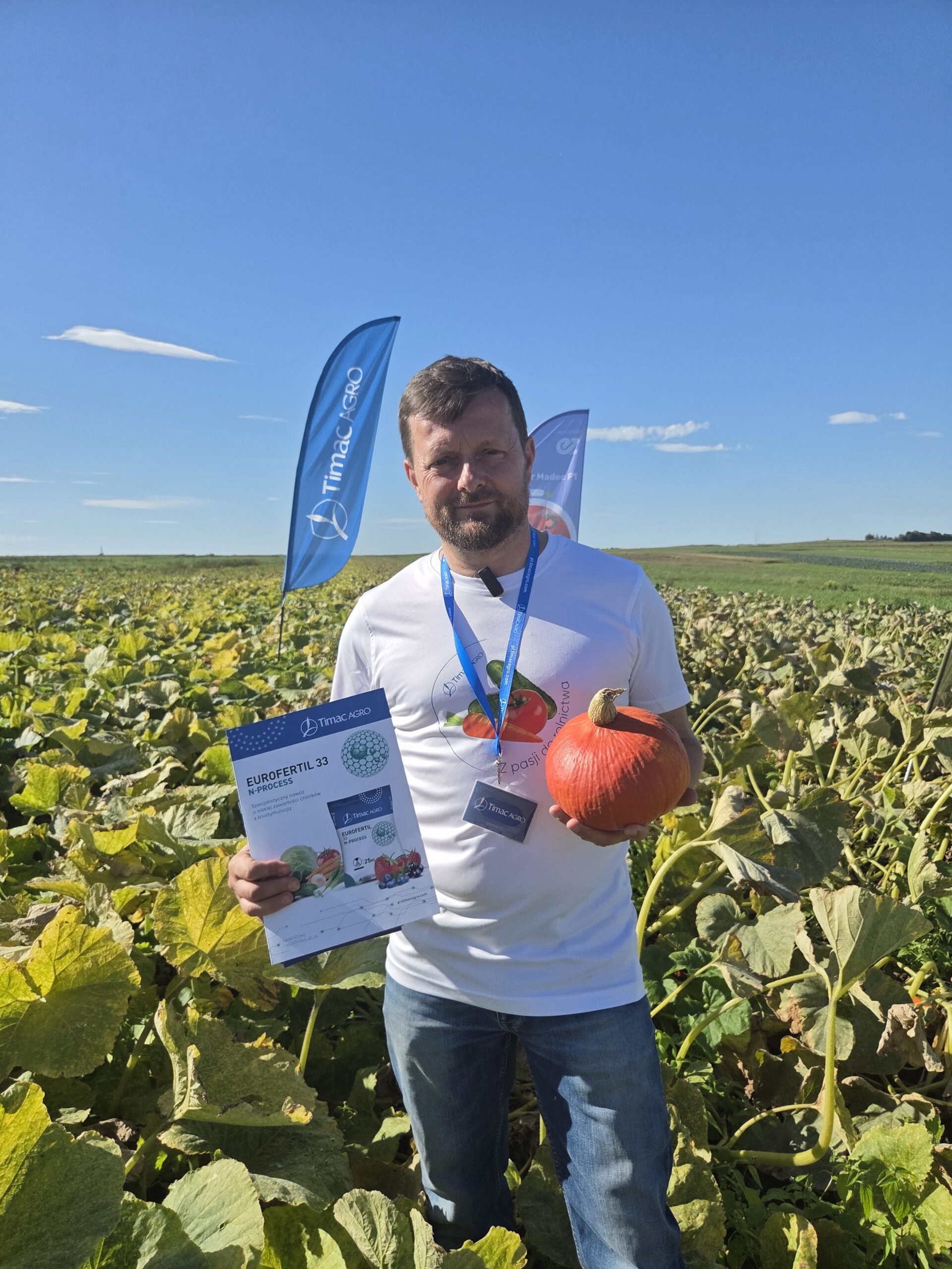 W gospodarstwie Państwa Kwietniów posadzono rozsadę dyni w drugiej połowie czerwca, a przedplon stanowiły wczesne kalafiory. Stąd też stanowisko było stosunkowo zasobne w składniki pokarmowe. Podjęto więc decyzję by nawożenie dyni oprzeć o zastosowanie kompleksowego nawozu posypowego Eurofertil 33 N-Process o niskiej zawartości chlorków. Zawiera on 8% N, 8% P2O5, 17% K2O, 3% MgO, 29% S, 8% CaO i 14% CaCO3, 0,15% B i 0,1% Zn. Zastosowana dawka wynosiła 400 kg/ha. Choć uznajemy tę dawkę za minimalną, wystarczyła ona, by uzyskać satysfakcjonujący plon – mówili przedstawiciele Timac Agro. Warto podkreślić, że celem uprawy było otrzymanie owoców o wysokiej przydatności do przechowywania. Stąd też właściwe odżywienie azotem (bez ryzyka przedawkowania) traktowano jako kluczowe. Zawarte w tym nawozie kompleksy N-Process i Mezocalc m.in. zwiększają podaż azotu i stymulują jego metabolizm w roślinie oraz poprawiają pobieranie minerałów. Ponadto wspierają rozwój mikroorganizmów glebowych. Jak przekazał Crop Manager produkcji warzyw Tomasz Marasik, reprezentujący firmę Timac Agro, granulowany nawóz Eurofertil 33-N Process zawiera azot, który jest zamknięty w otoczce wapniowo-organicznej. Pozwala to na stopniowe uwalnianie tego makroelementu dla roślin, dzięki czemu nawożenie dyni było zoptymalizowane.