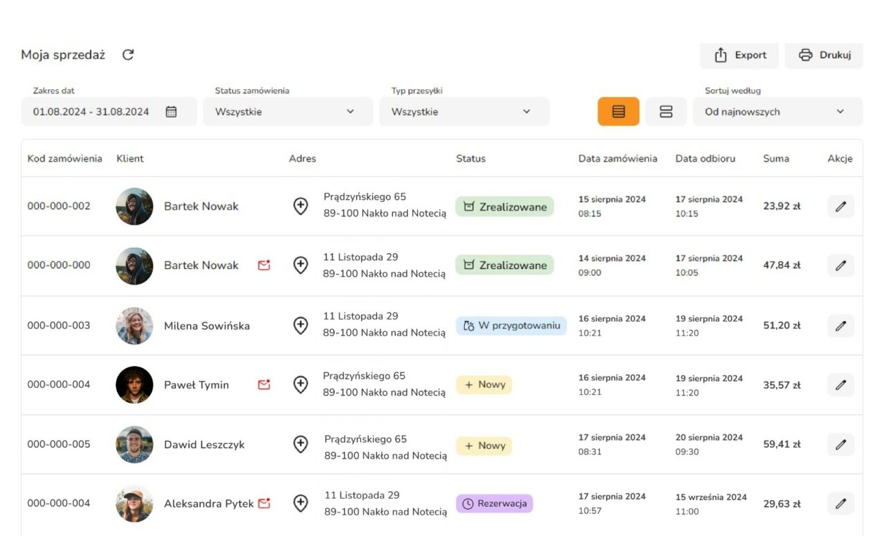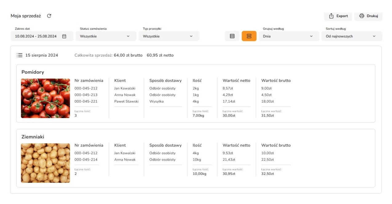 Zarządzanie zamówieniami nie tylko było zbiorem samych zamówień, ale też takim narzędziem, które przyspiesza pracę. Jest stworzona funkcja grupowania zamówień po towarach, która pozwala zobaczyć ile jakiego towaru, na jaki dzień trzeba przygotować, żeby zobaczyć czy wszystko zostało zebrane.