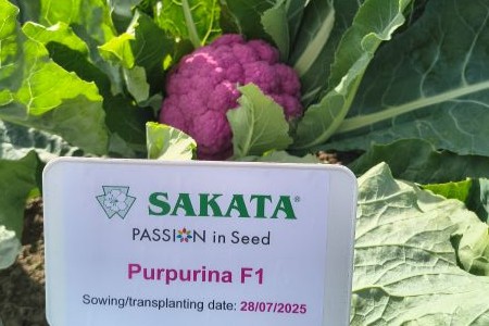 Purpurina F1 to wczesny, intensywnie fioletowy kalafior (wegetacja 55–65 dni) przeznaczony na świeży rynek i do produkcji różyczek. Jest idealny na ciepłe pory roku – ma dobrą odporność polową i wzniesiony pokrój.