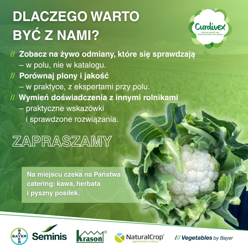 Podczas spotkania zaprezentujemy najnowsze odmiany kalafiorów Seminis – w praktyce, bezpośrednio na polu, z możliwością porównania plonów i jakości. Będzie to również okazja do wymiany doświadczeń między rolnikami, a także do rozmów z ekspertami z zakresu odmian, uprawy i ochrony roślin.