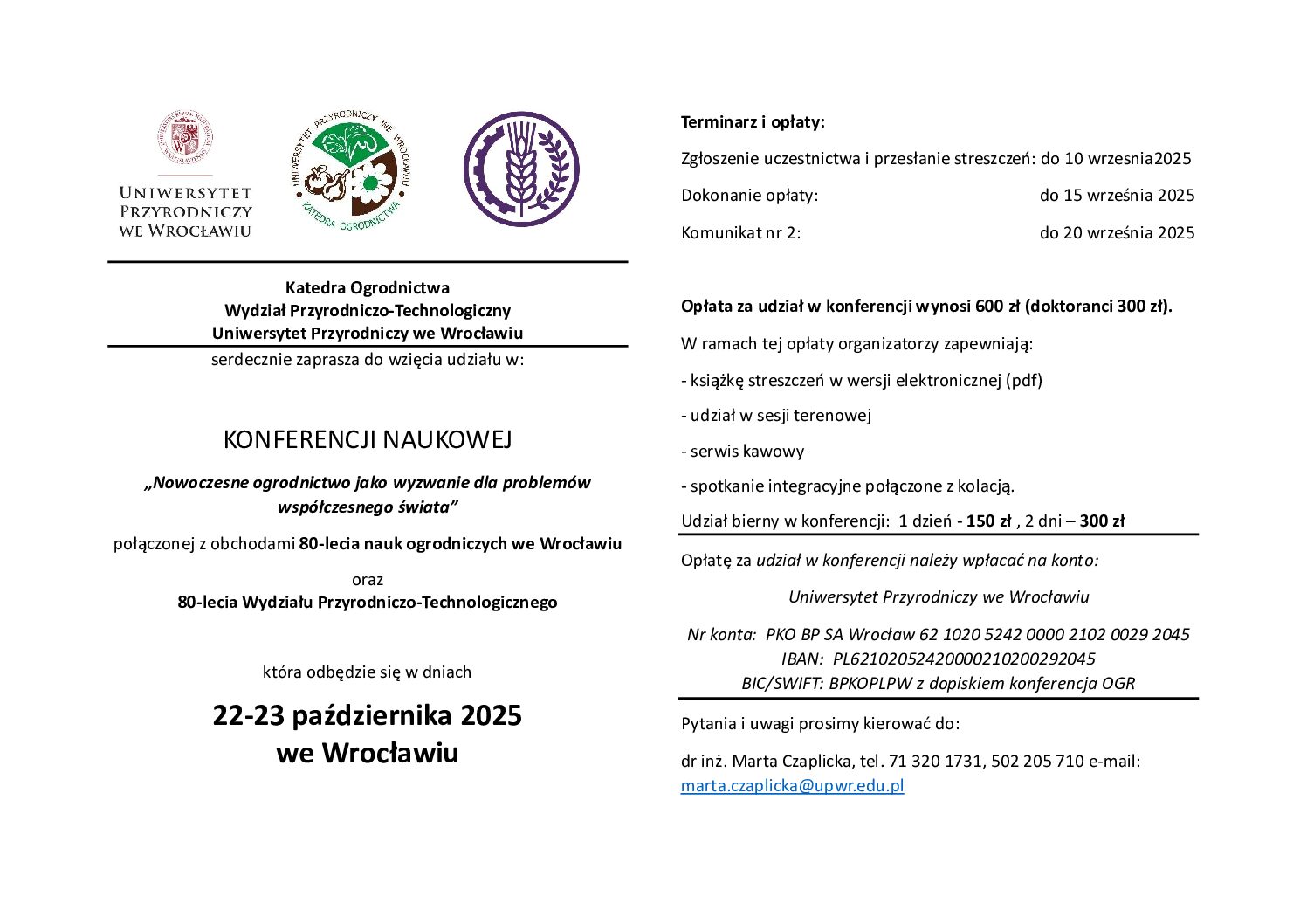 Konferencją połączona jest z obchodami 80-lecia ogrodnictwa na naszym terenie i jest organizowana tuż przed wydarzeniami 80-lecia Wydziału Przyrodniczo-Technologicznego, w skład którego wchodzi nasza Katedra.