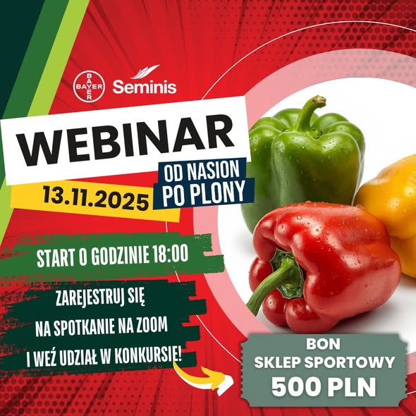 Aby wziąć udział w konkursie, zarejestruj się na webinar na Zoomie – samo dołączenie przez Facebooka nie uprawnia do udziału w konkursie. Nie przegap okazji, by poszerzyć wiedzę i poznać najnowsze kierunki w produkcji papryki w Polsce.